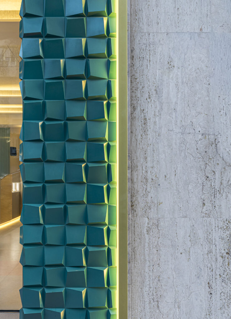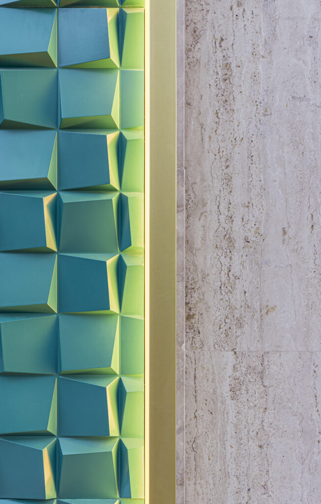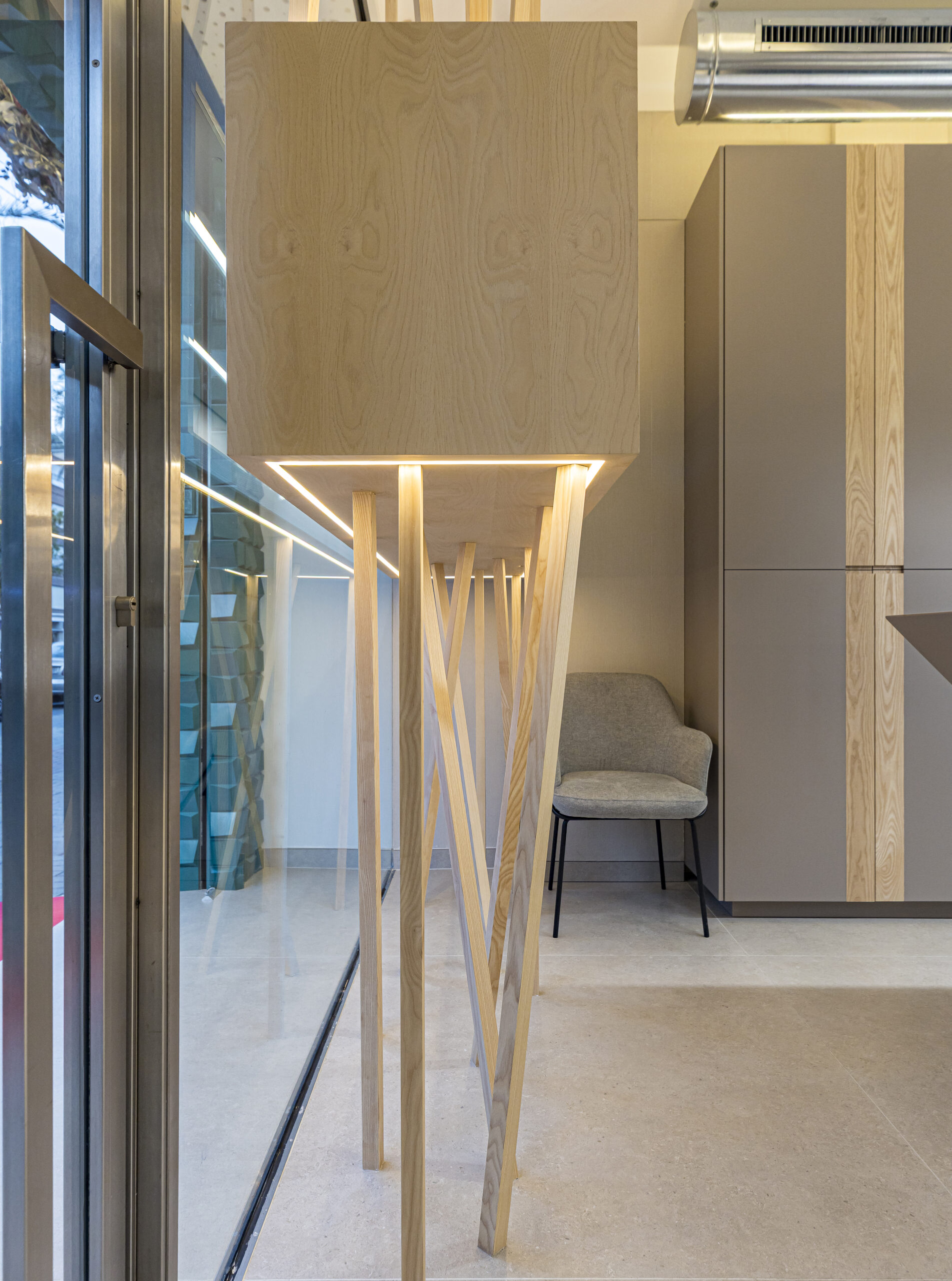El mostrador central, uno de los elementos más representativos del proyecto, se define por sus volúmenes geométricos limpios y su cuidada ejecución. Incorpora detalles en madera de fresno macizo acabado natural, presente tanto en el propio mostrador como en los tiradores de las puertas, aportando textura, contraste y calidez. La iluminación LED integrada en su base genera un elegante efecto flotante que refuerza la sensación de ligereza y exclusividad del espacio.