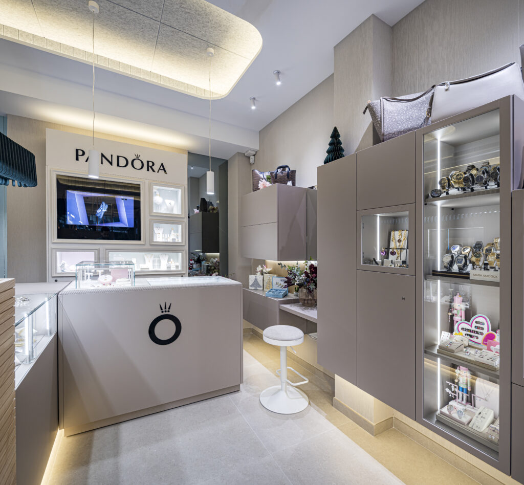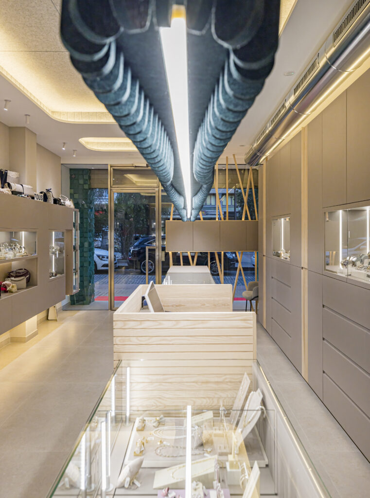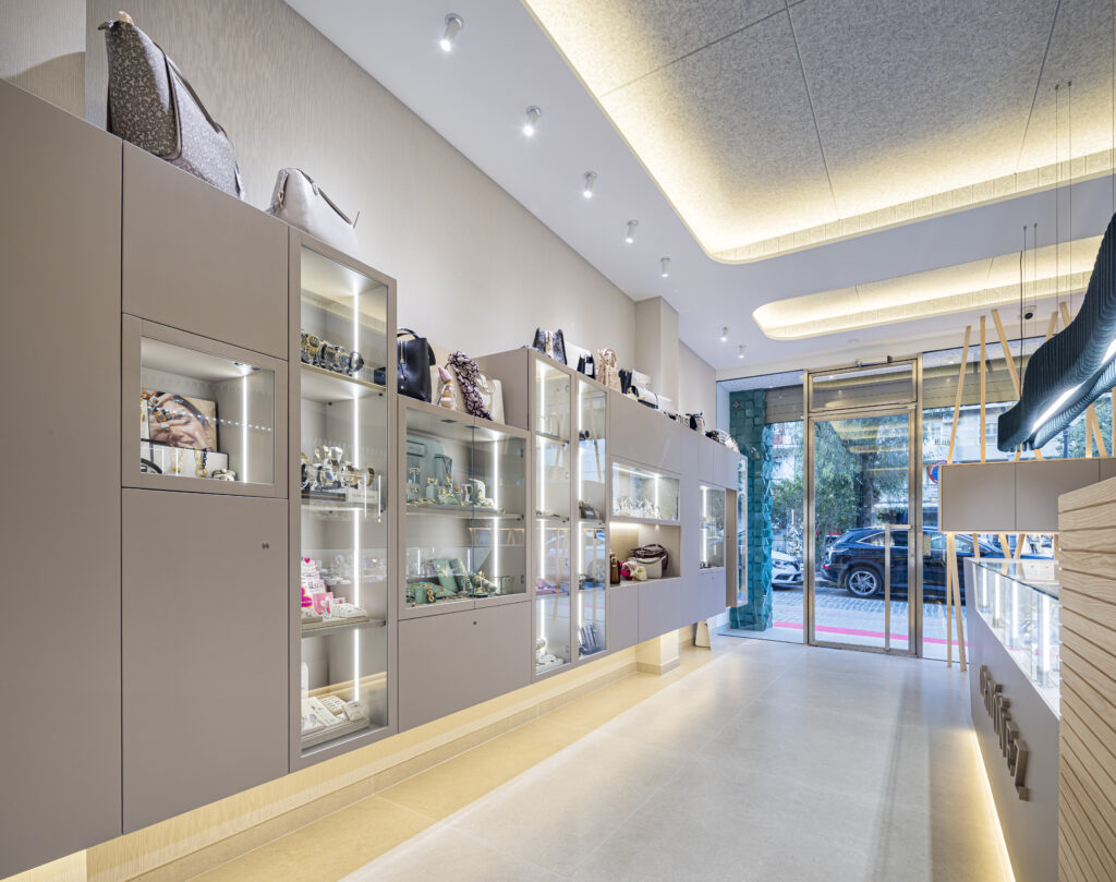 Todo el mobiliario ha sido fabricado íntegramente a medida, adaptándose con precisión al espacio y a las exigencias específicas de una joyería de alta gama. El acabado protagonista es un lacado mate en color taupe (NCS S 4005-Y50R), un tono cálido y atemporal que aporta serenidad visual al conjunto y permite que joyas y relojes destaquen con naturalidad.