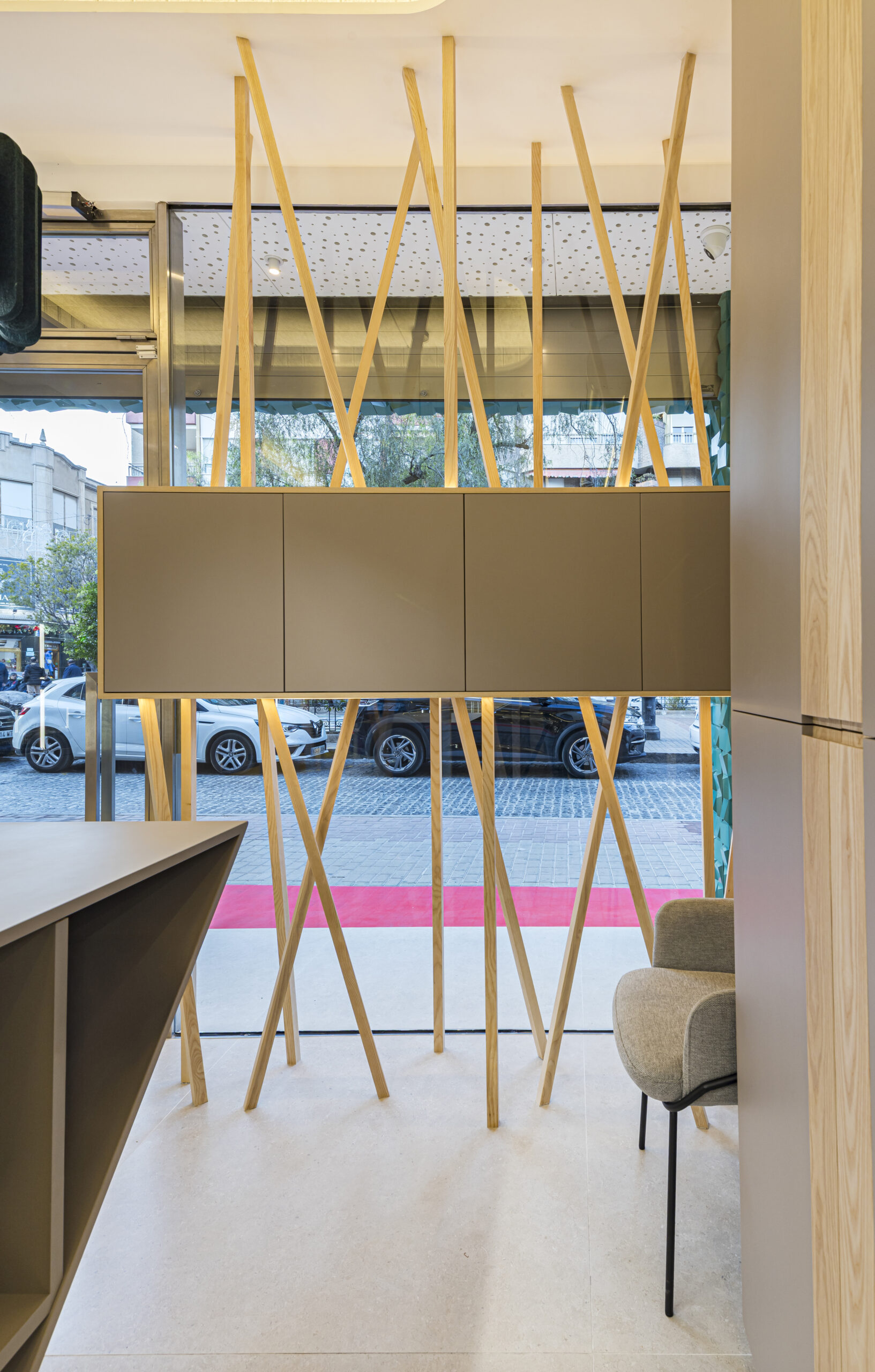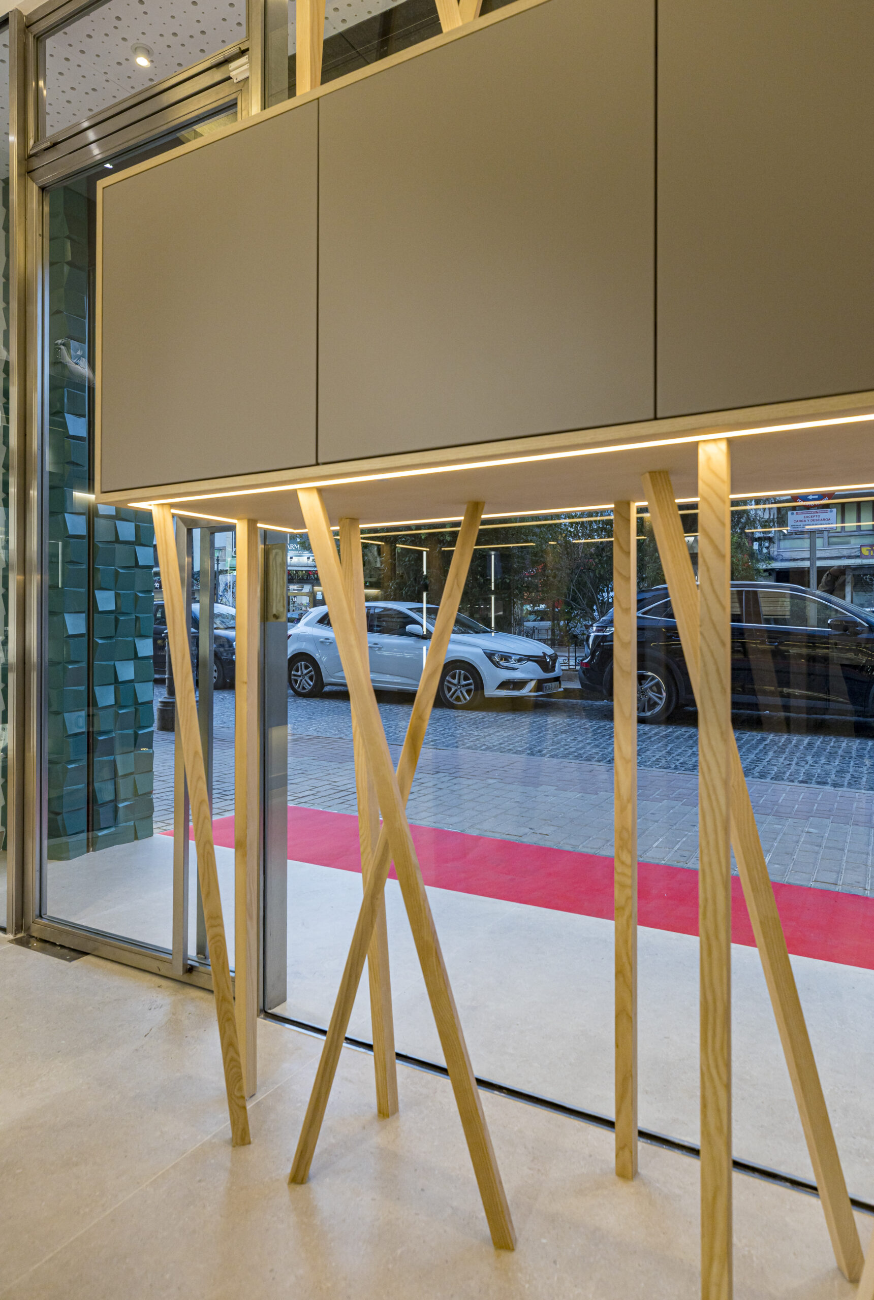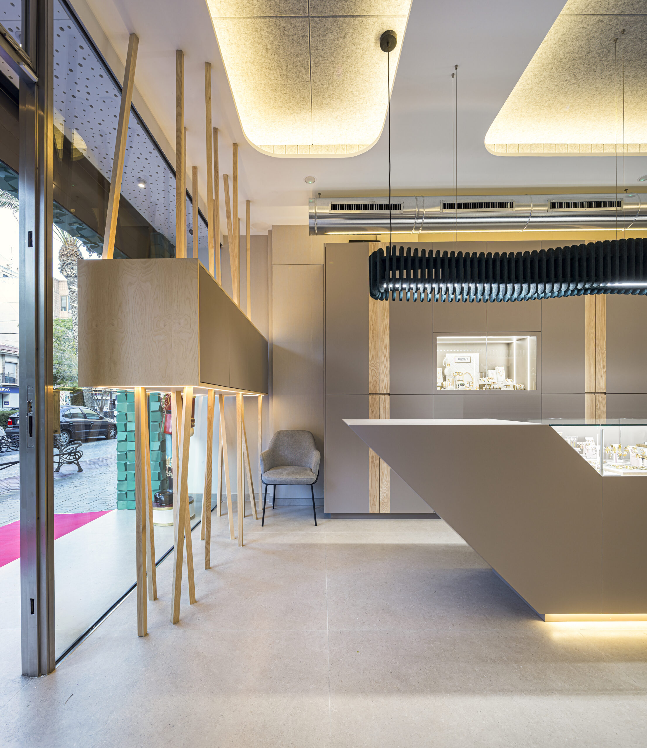 Especial protagonismo adquiere el escaparate, concebido como una auténtica pieza arquitectónica. La palillería de fresno macizo acabado natural crea un marcado efecto flotante, elevando visualmente el mueble y aportando dinamismo, profundidad y una imagen distintiva desde el exterior. Este diálogo entre madera, luz y volumen convierte el escaparate en un elemento icónico y reconocible del proyecto.