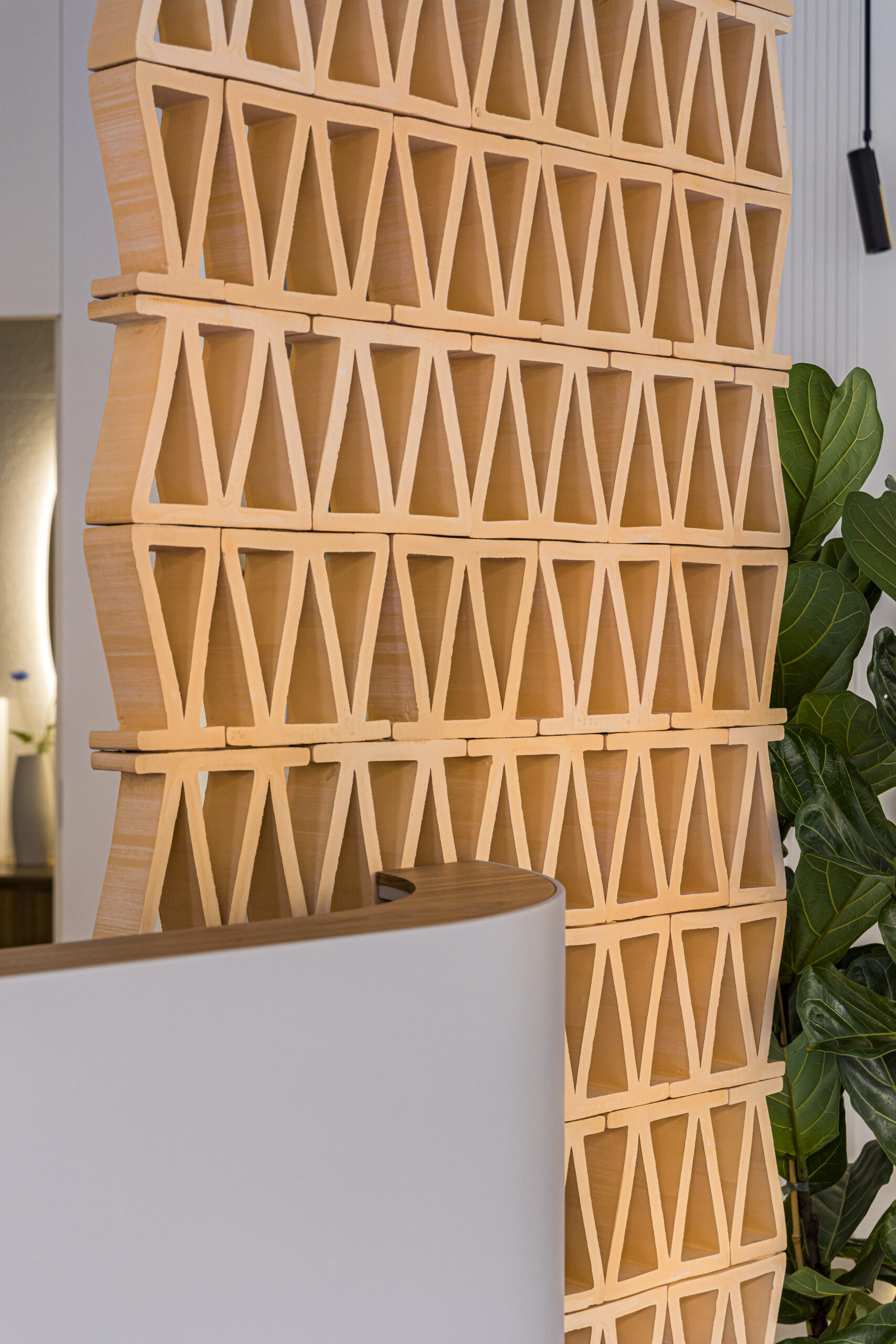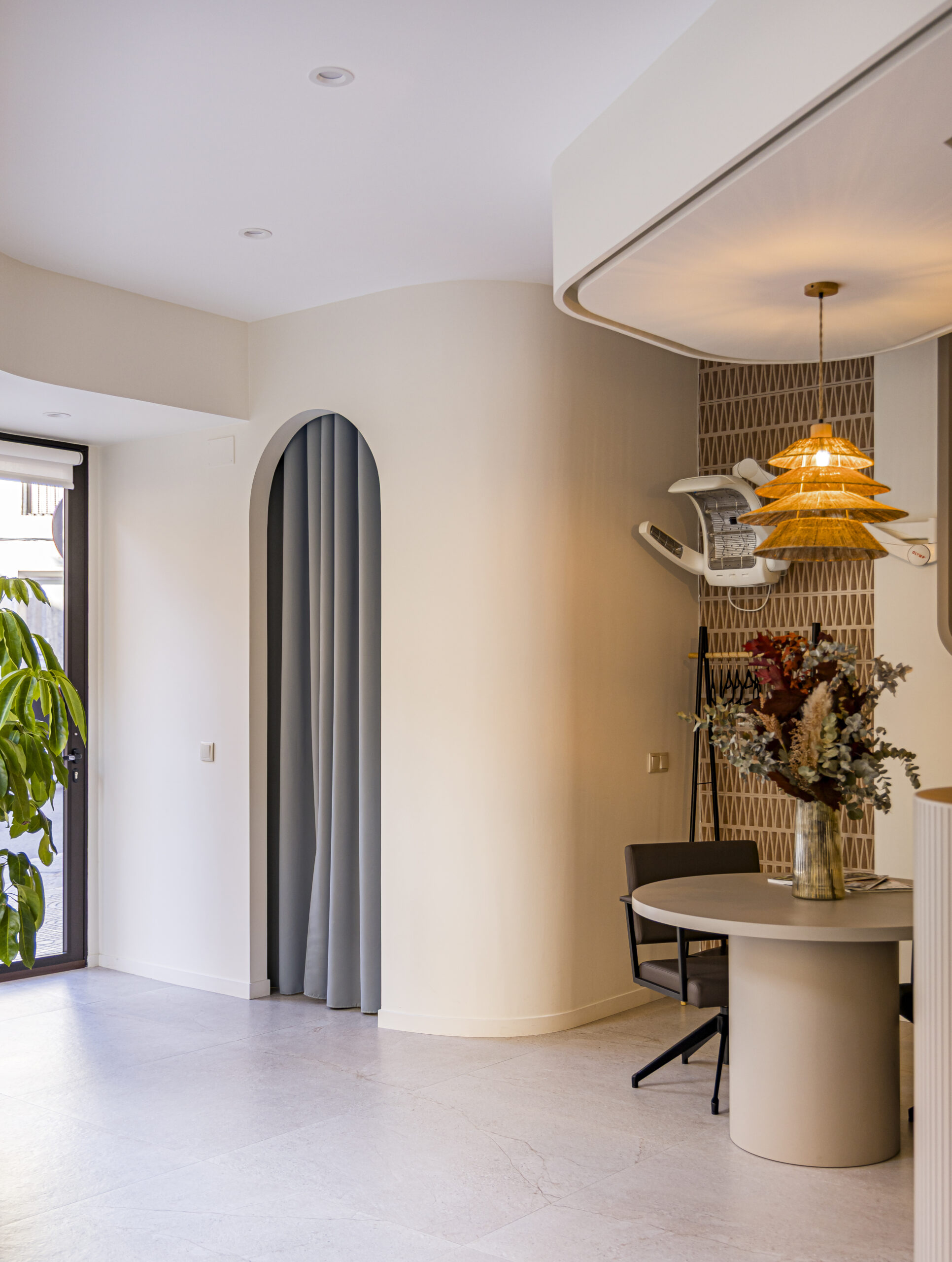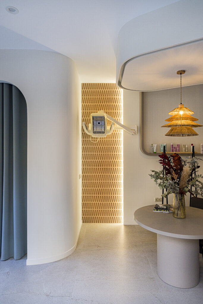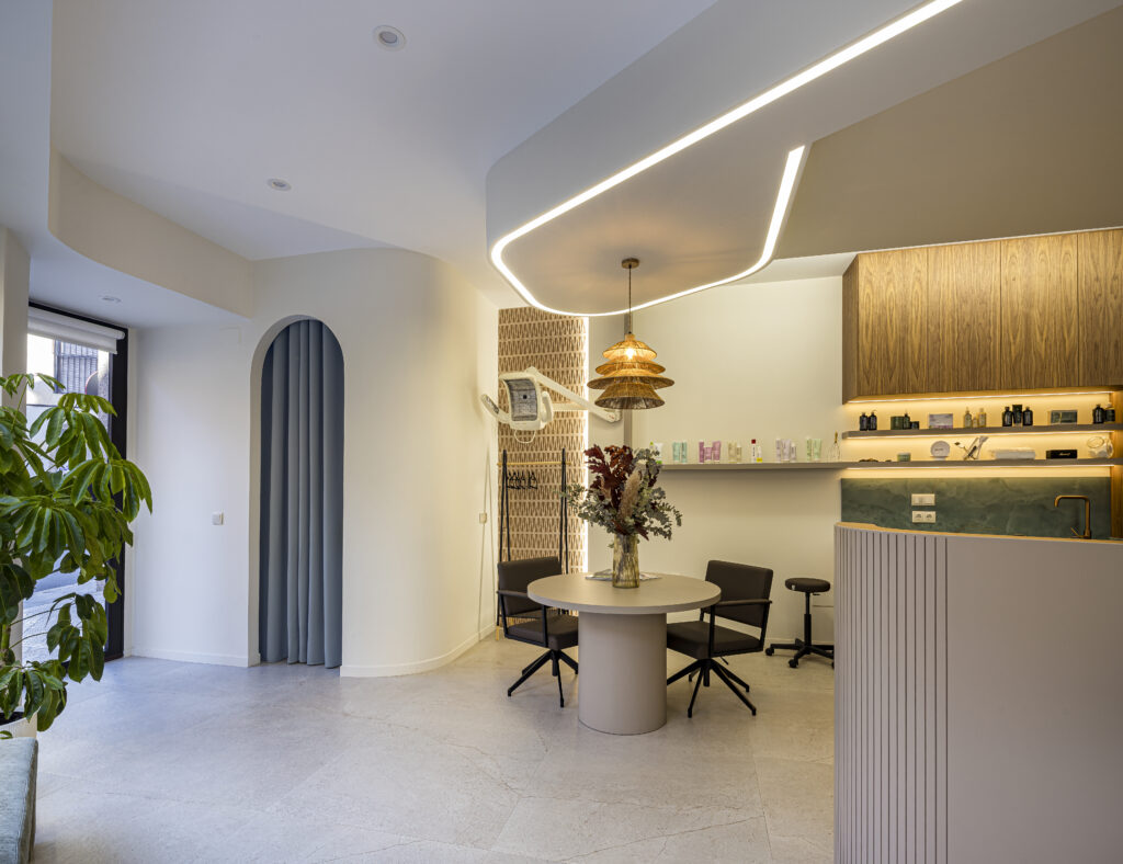 Los elementos lacados en acabado mate color taupe aportan equilibrio y suavidad visual, creando un ambiente sereno que realza la presencia de la madera natural. Este acabado se integra de manera natural con las líneas curvas y los volúmenes del mobiliario, reforzando la identidad del espacio y aportando continuidad al conjunto.